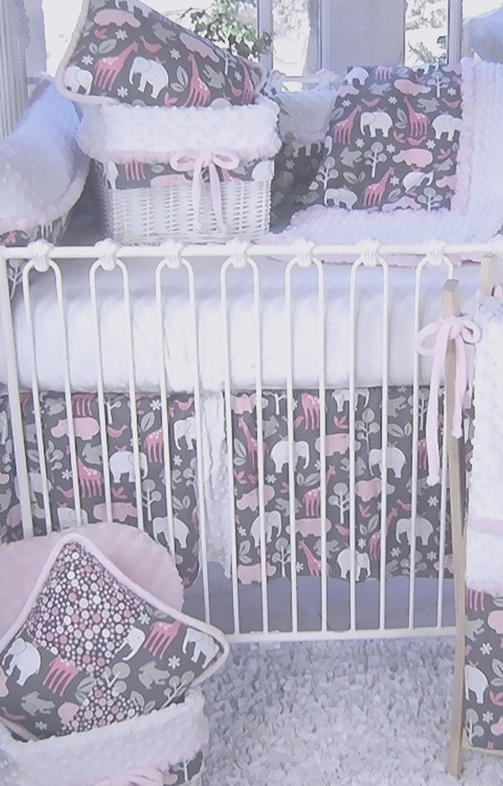 The complete Cookies Pink collection has an array of coordinating accessories including; crib blanket, fitted crib sheet, crib skirt, accent pillows, basket liner, candlestick lamp, lampshade, window valance, diaper stacker, nursery hamper, and rail guard cover.