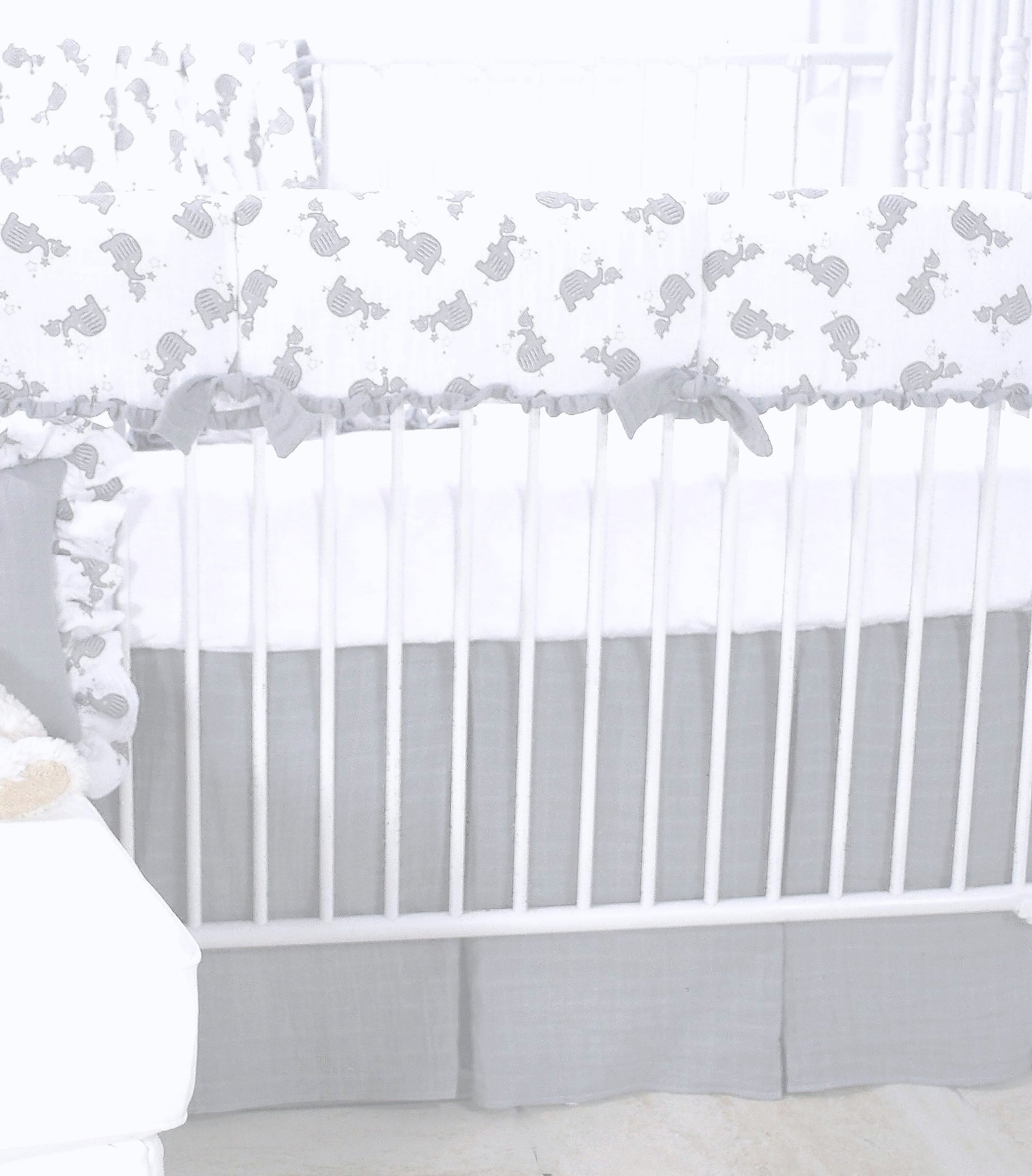 This four piece nursery collection includes; (1) blanket (1) white crib sheet (1) grey crib skirt 16" (1) rail guard cover