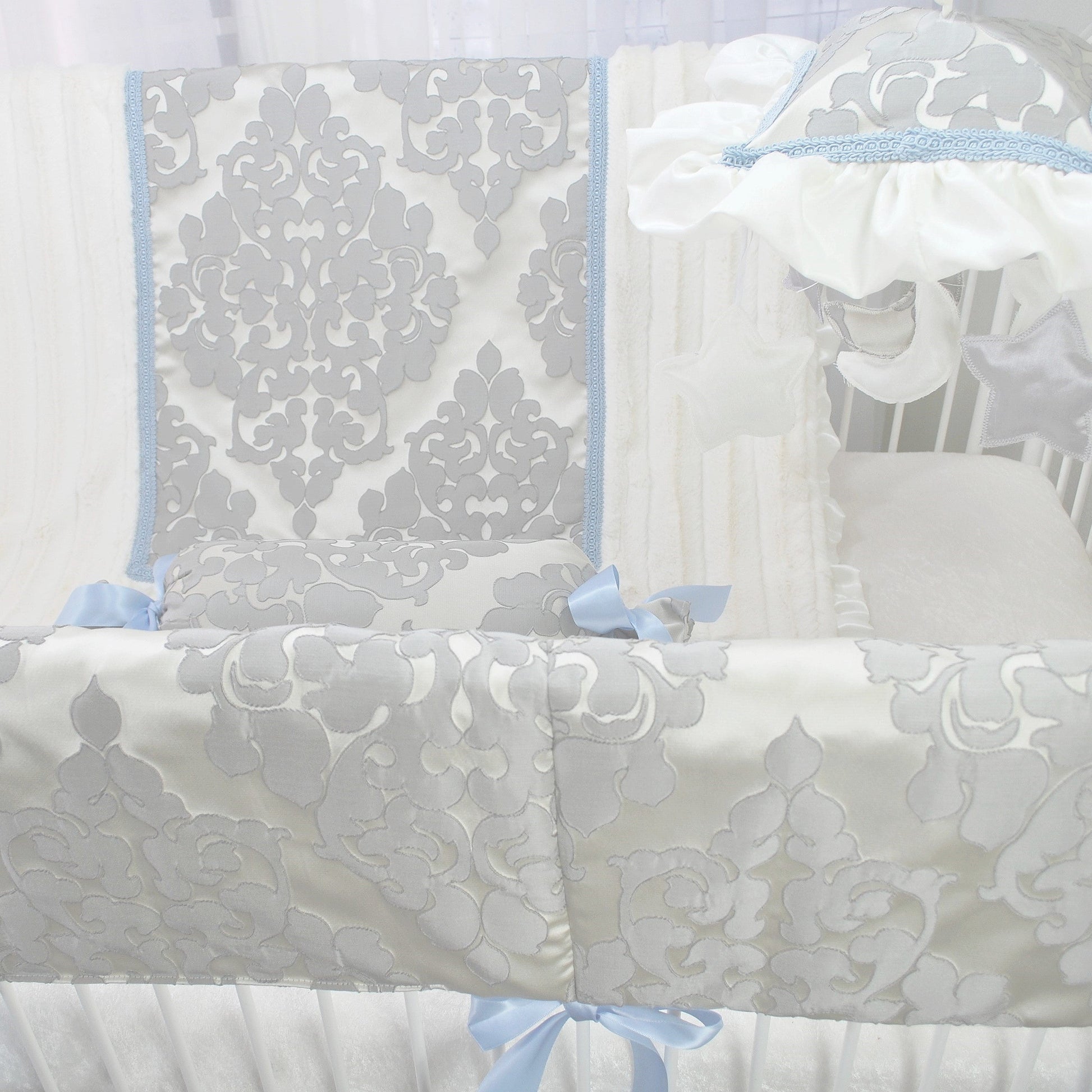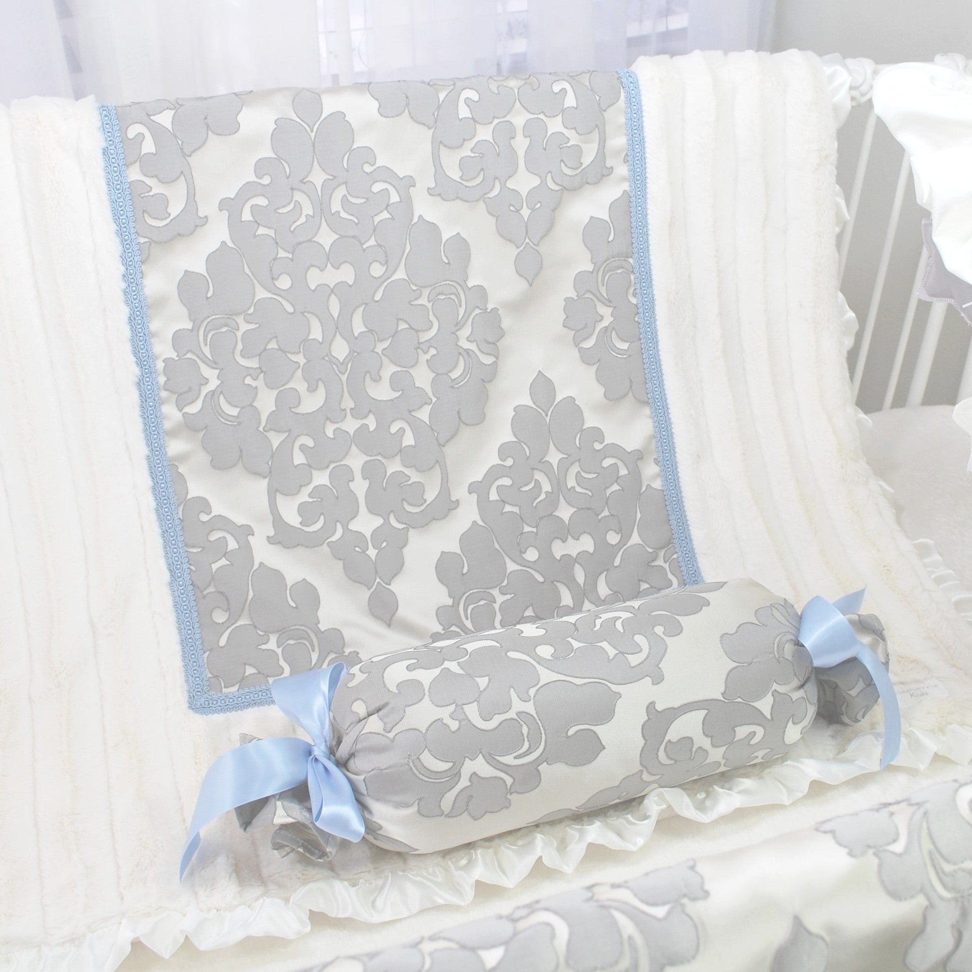 The complete LuLu Blue collection has an array of coordinating accessories including; crib blanket, crib sheet, crib skirt, accent pillows, musical mobile, rail guard cover, basket liner, standard and long zippered pillow covers, window valance, curtains, diaper stacker, and nursery hamper