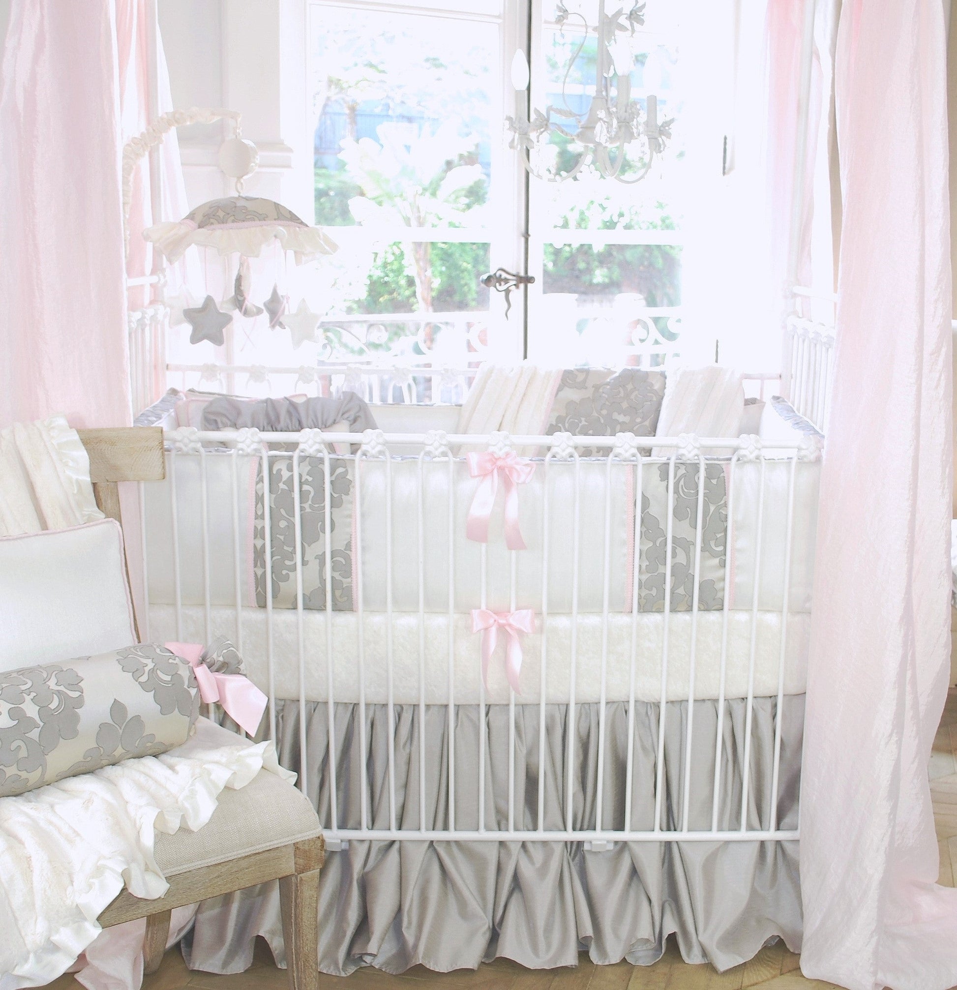 The complete LuLu collection has an array of coordinating accessories including; crib blanket, crib sheet, crib skirt, accent pillows, musical mobile, crib bows, basket liner, lampshade, window valance, curtains, diaper stacker, nursery hamper, and rail guard cover.