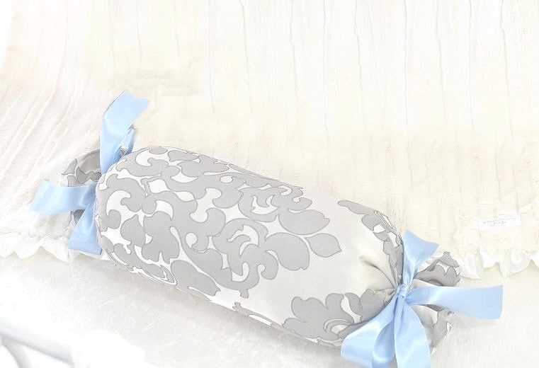 The complete LuLu Blue collection has an array of coordinating accessories including; crib blanket, crib sheet, crib skirt, accent pillows, musical mobile, rail guard cover, basket liners, crib bows, window valance, curtains, standard and long zippered pillow covers, diaper stacker, and nursery hamper
