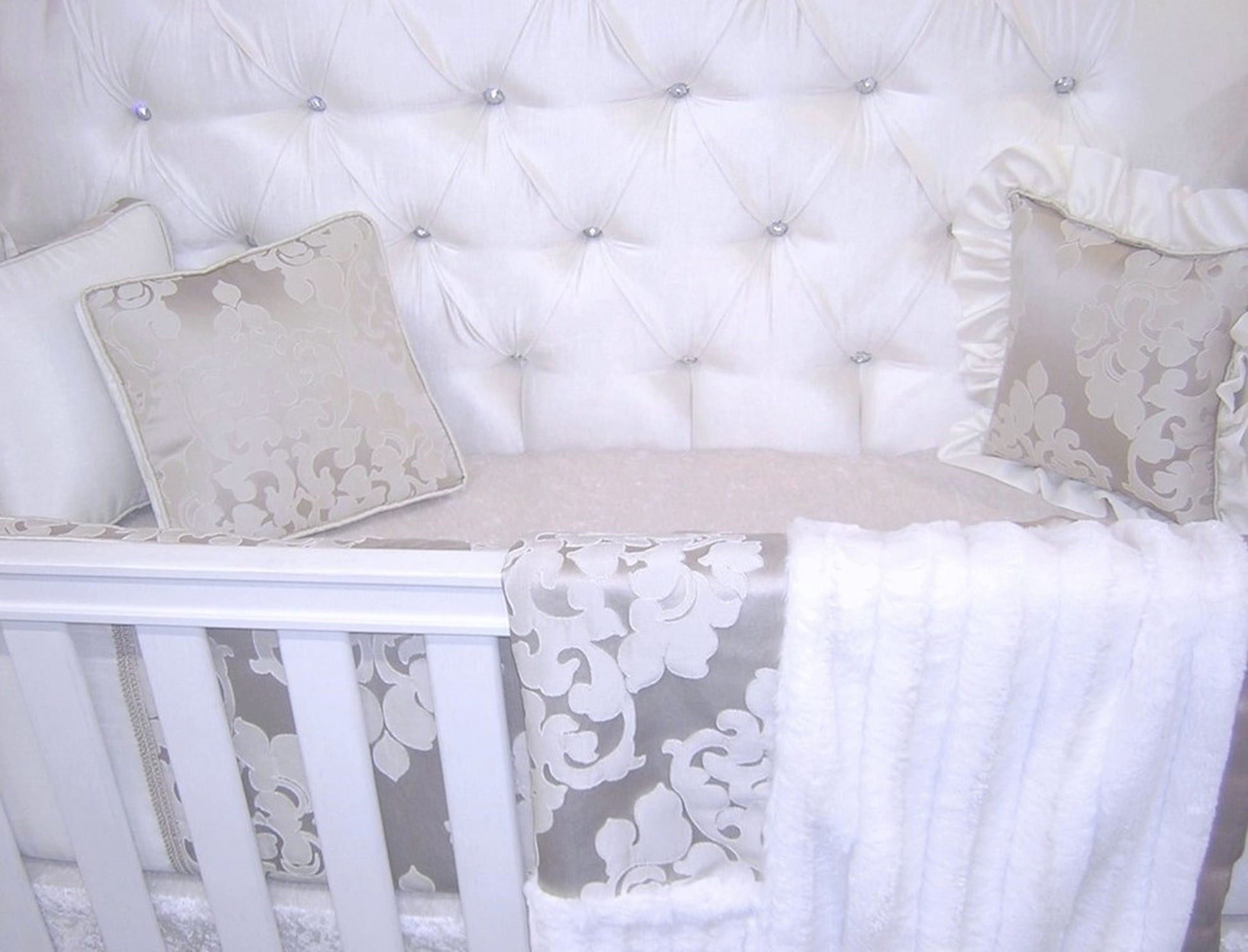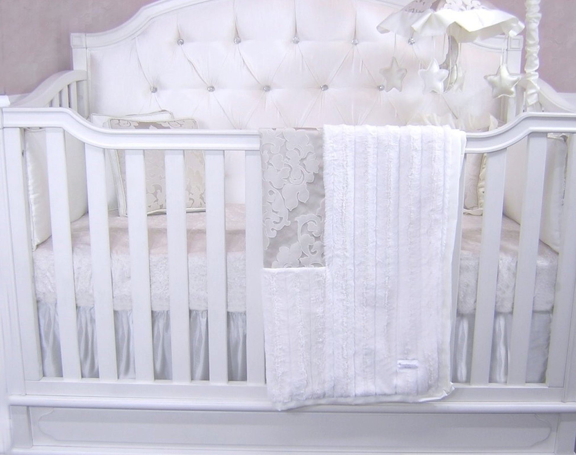 Moon Petal's four piece nursery collection includes a soft baby blanket, fitted crib sheet, crib skirt, and jacquard rail guard cover.