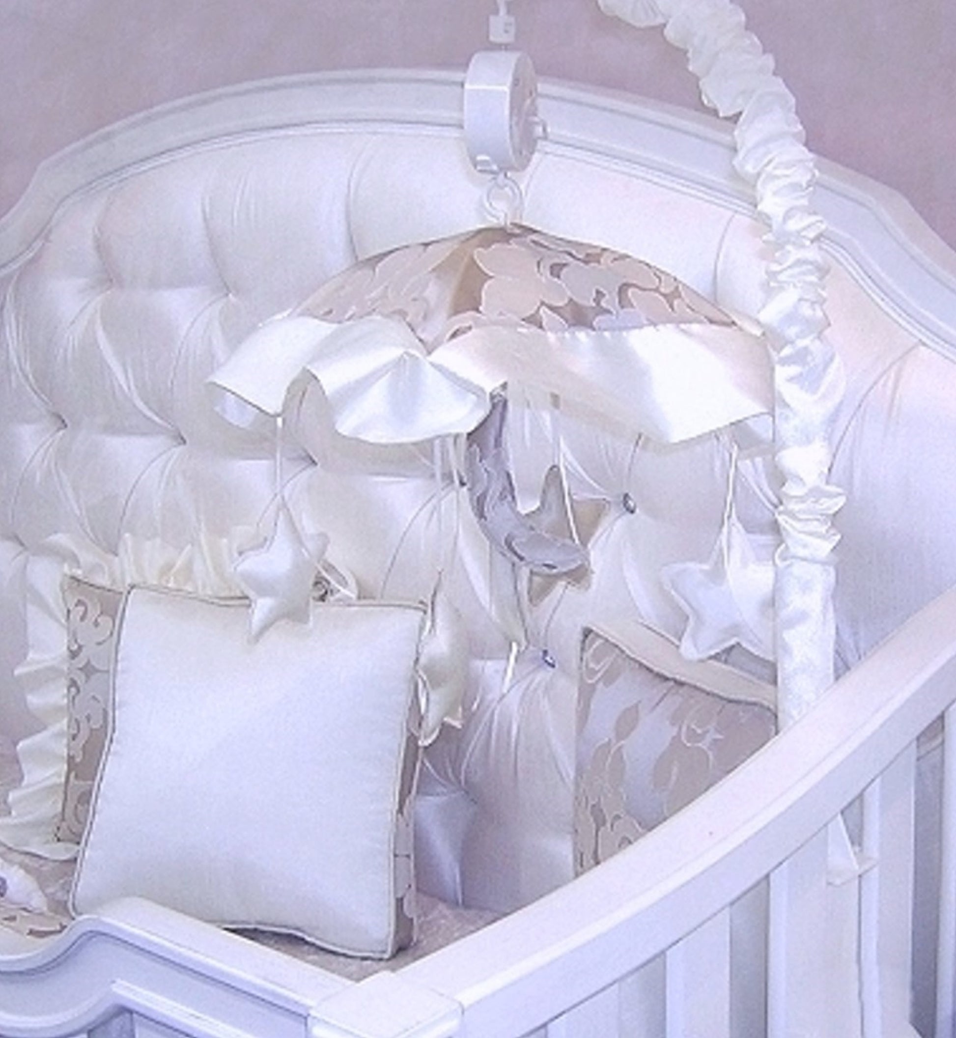 The complete Moon Petal collection has an array of coordinating accessories including; crib blanket, fitted crib sheet, crib skirt, accent pillows, musical mobile, basket liner, candlestick lamp, lampshade, window valance, diaper stacker, nursery hamper, and rail guard cover.