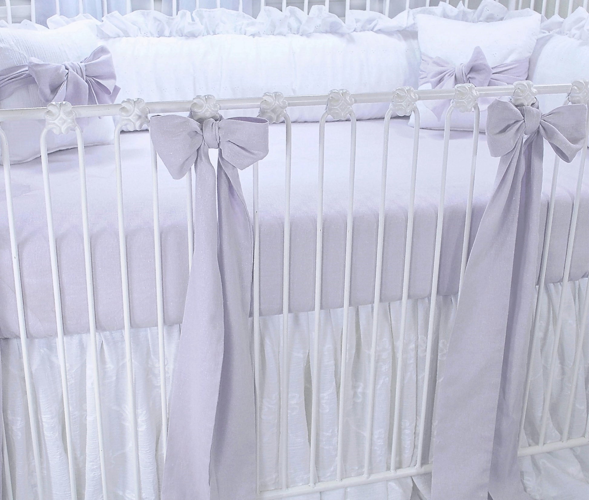 The complete Orchid Lavender Linen collection has an array of coordinating accessories including; baby blanket, crib sheet, crib skirt, accent pillows, crib bows, musical mobile, basket liner, window valance, nursery hamper, and rail guard cover.