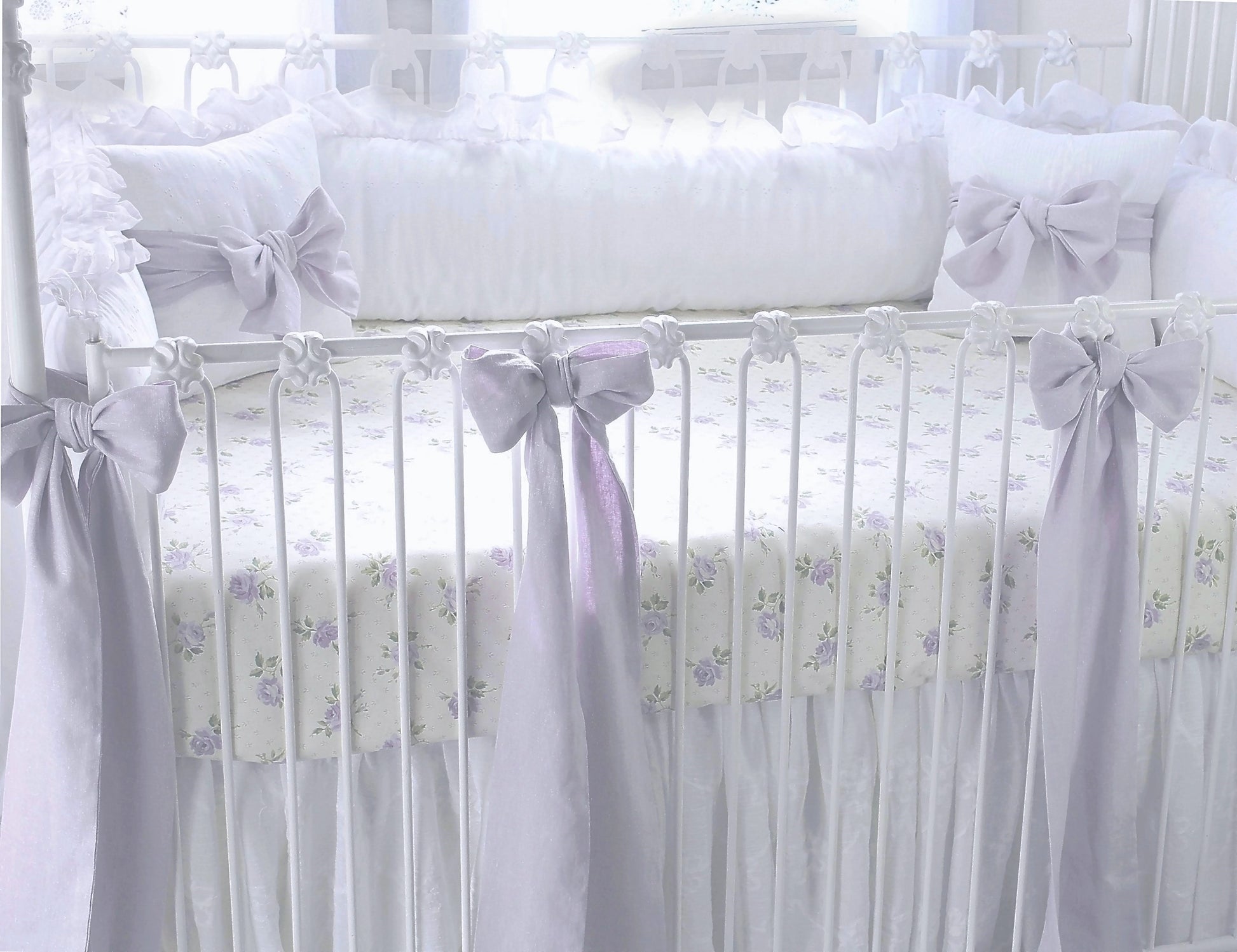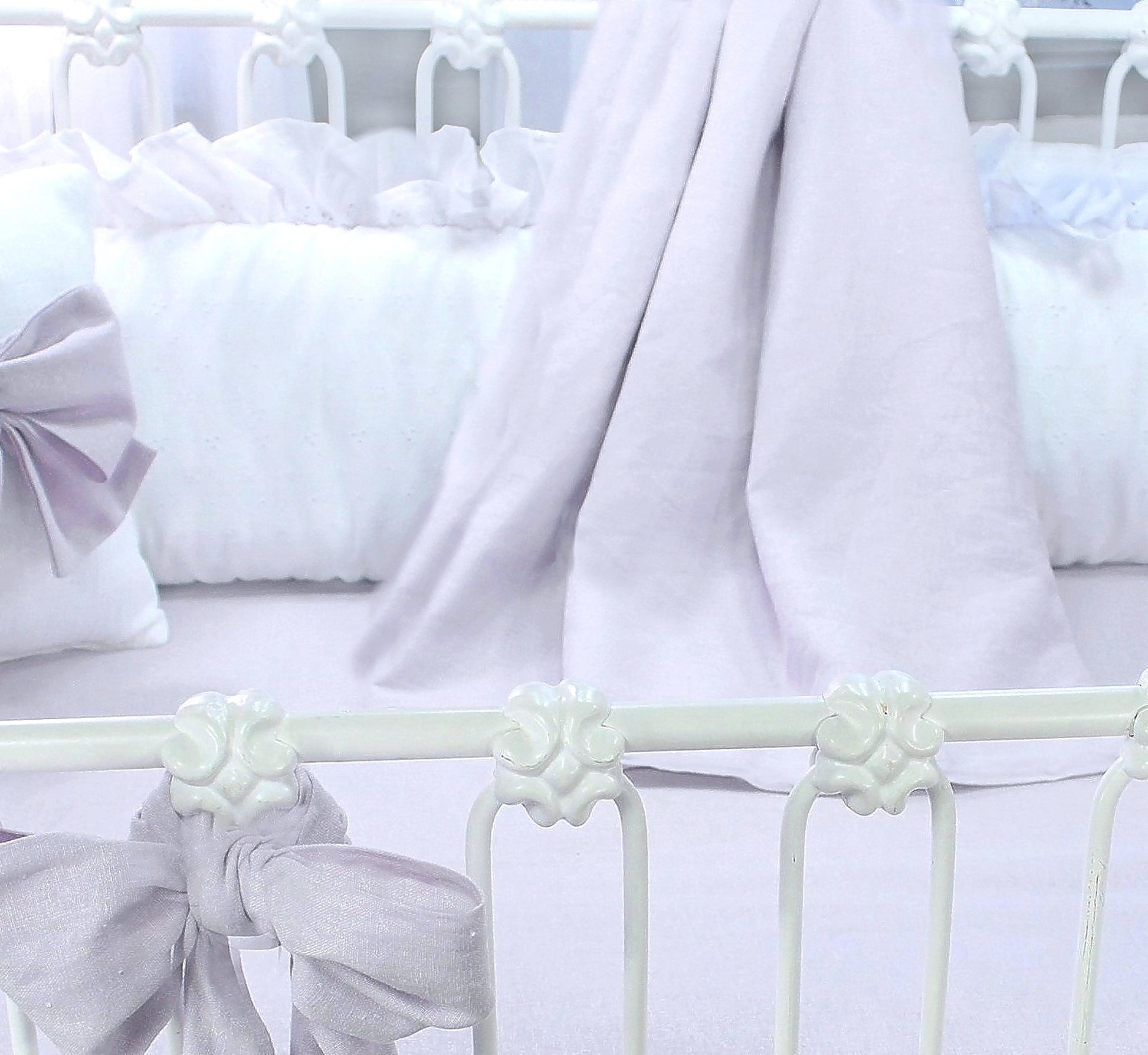 The complete Orchid Lavender Linen collection has an array of coordinating accessories including; baby blanket, crib sheet, crib skirt, accent pillows, musical mobile, basket liner, window valance, nursery hamper, and rail guard cover.