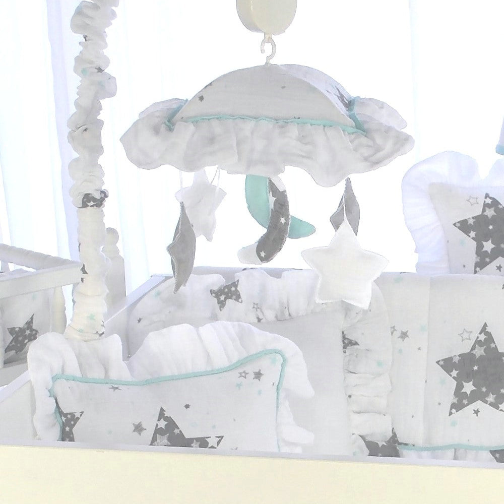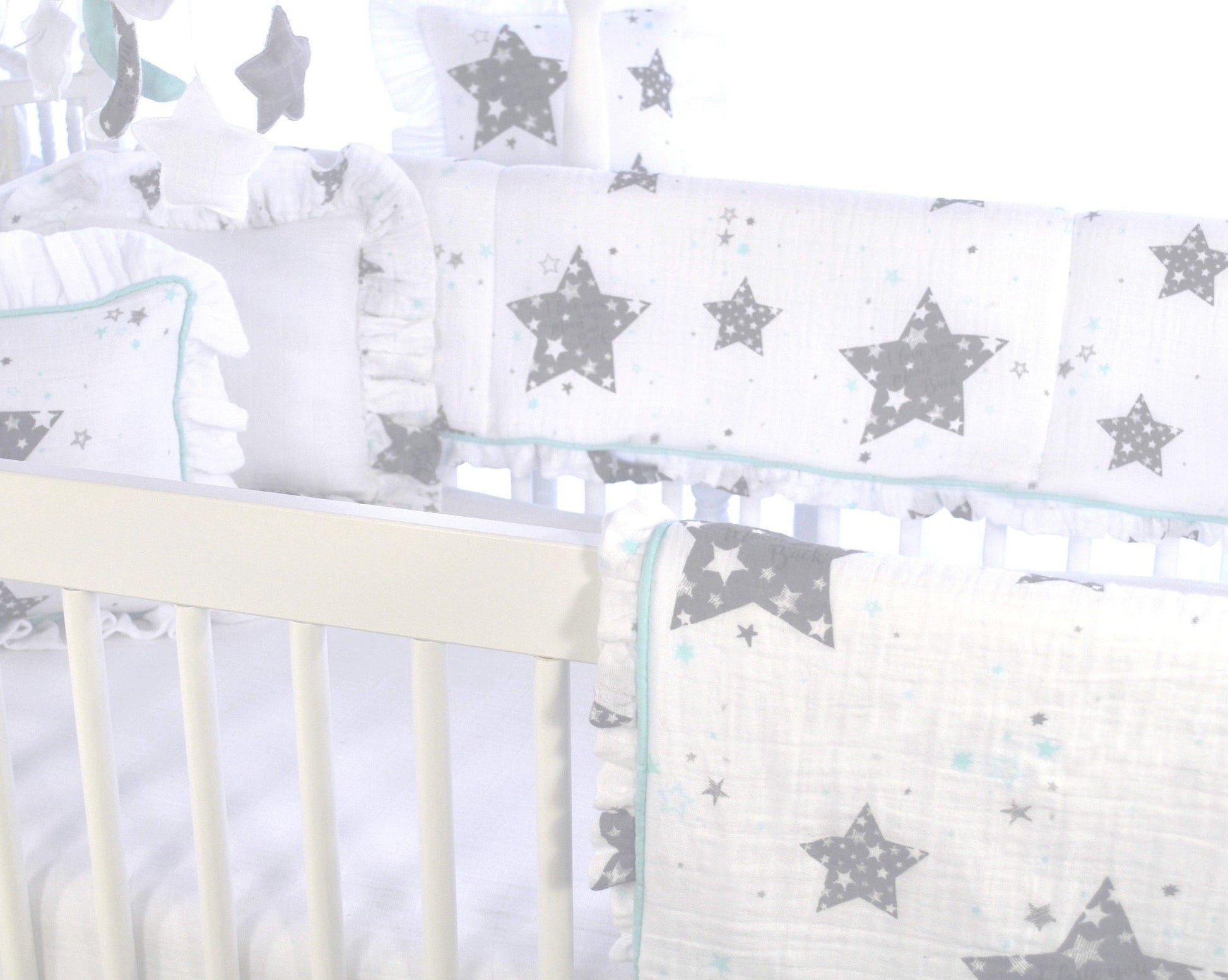 This cute 3 Piece crib bedding set is made with soft washable breathable swaddle cotton. Love you to the Moon grey stars and tiny teal stars on white cotton background